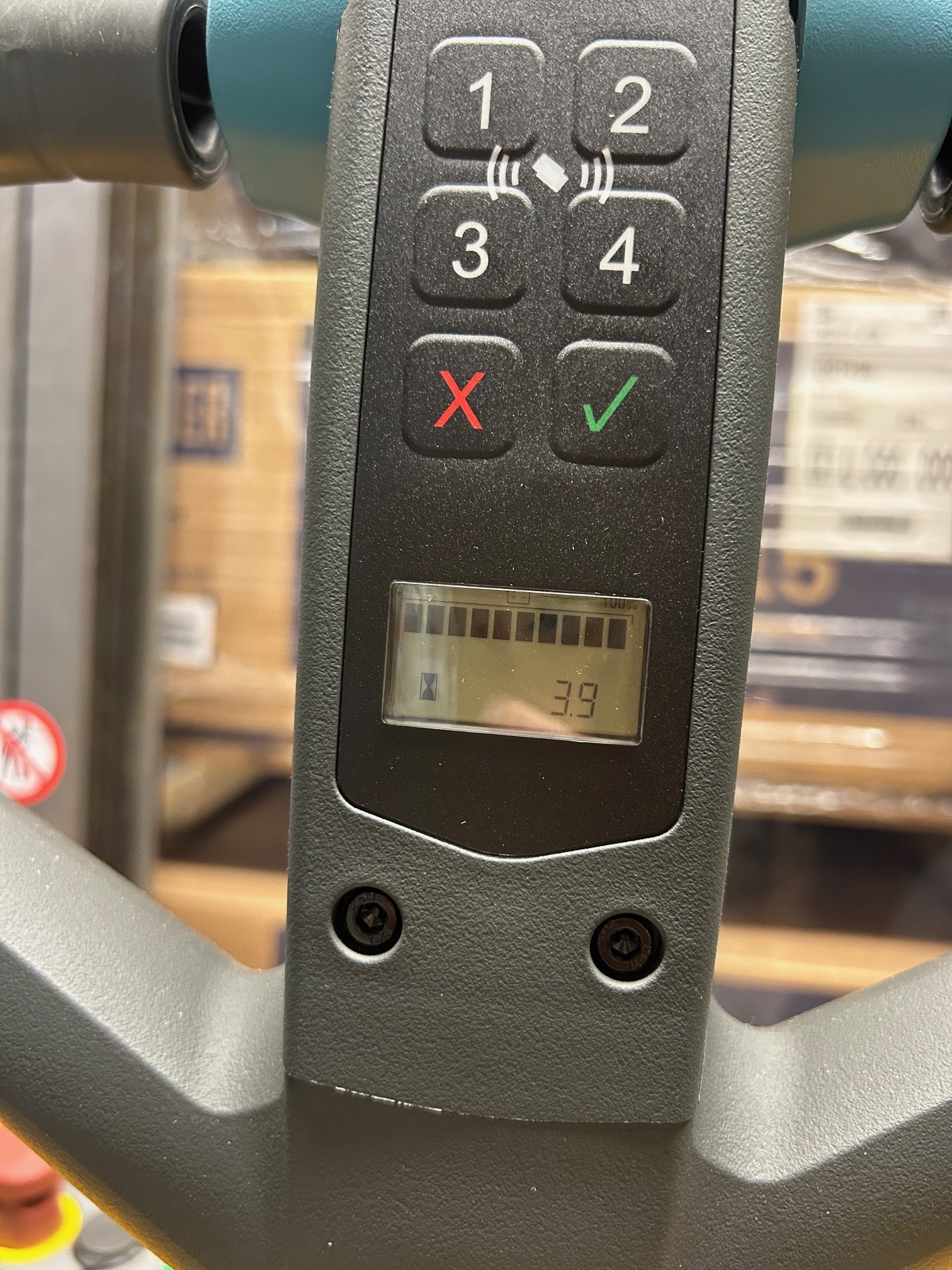 Käytännössä katsoen täysin uusi vuoden 2023 mallia oleva Jungheinrich -pinoamisvaunu. Alkuperäiset pehmusteetkin vielä kiinnitettynä vaunun kylkiin.